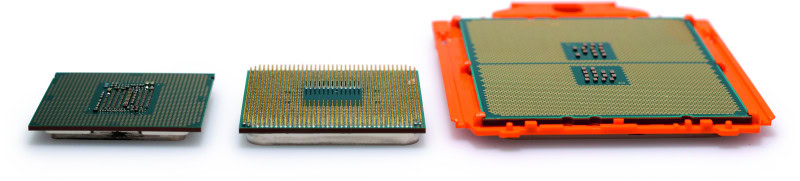 AMD en Intel gebruiken verschillende verbindingen tussen de cpu en socket. Alleen AMD’s AM4 (midden) heeft nog pinnetjes aan de cpu. Intels LGA1151v2- (links) en AMD’s Threadripper-platform (rechts) hebben mechanisch minder kwetsbare contactpads op de onderkant van het cpu-omhulsel.
